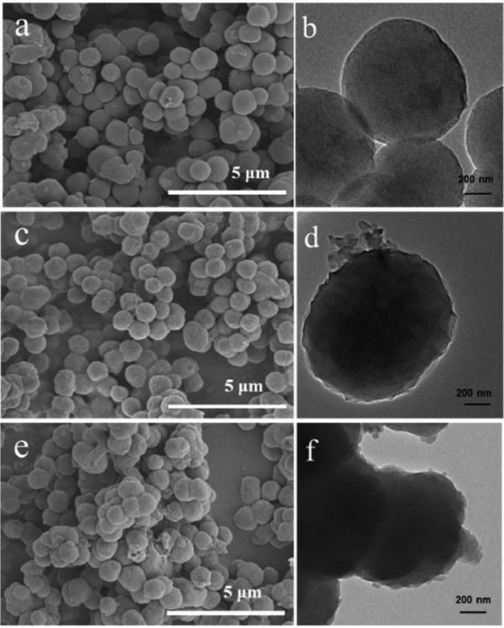 Figure 1. (a) COF、(c) IL@COF 和 (e) IL-COF 的SEM 圖像。(b) COF、(d) IL@COF 和 (f) IL-COF 的 TEM 圖像。