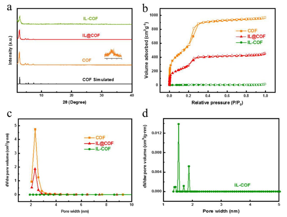 Figure 3. (a)合成后的 COF、IL-COF、IL@COF 和模擬 COF 的PXRD 圖。(b) COF、IL-COF和IL@COF的氮吸附-脫附等溫線。(c) COF、IL-COF 和 IL@COF 的孔徑分布。(d) 通過(guò) NLDFT 分析方法得到的 IL-COF 的孔徑分布。