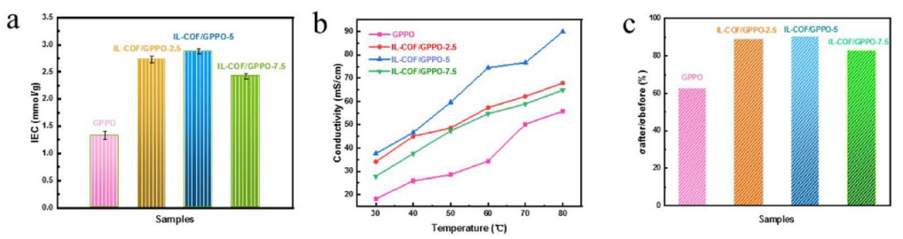 Figure 8. (a) GPPO 和 IL-COF/GPPO-X 的IEC值。(b) 膜的氫氧化物電導(dǎo)率。(c) 堿性穩(wěn)定性測(cè)試后膜的氫氧化物電導(dǎo)率的剩余比率。