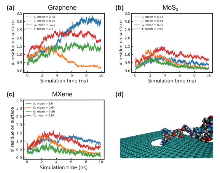 圖3、(a-c)在10ns 的模擬過程中,DNA 堿基的平均數(shù)量分別吸附在石墨烯、 MoS
