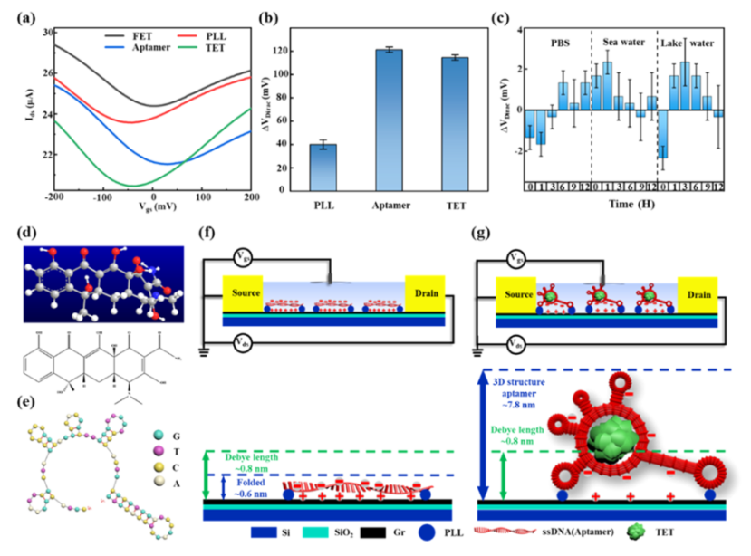 Dirac (d)TET的結(jié)構(gòu)示意圖;(e)適體三維(3D)結(jié)構(gòu);(f,g)通過(guò)適體和TET相互作用用于抗生素檢測(cè)的靜電門(mén)控機(jī)制和傳感機(jī)制。在圖(b,c)中,誤差線表示從三次測(cè)試中獲得的相對(duì)標(biāo)準(zhǔn)偏差。