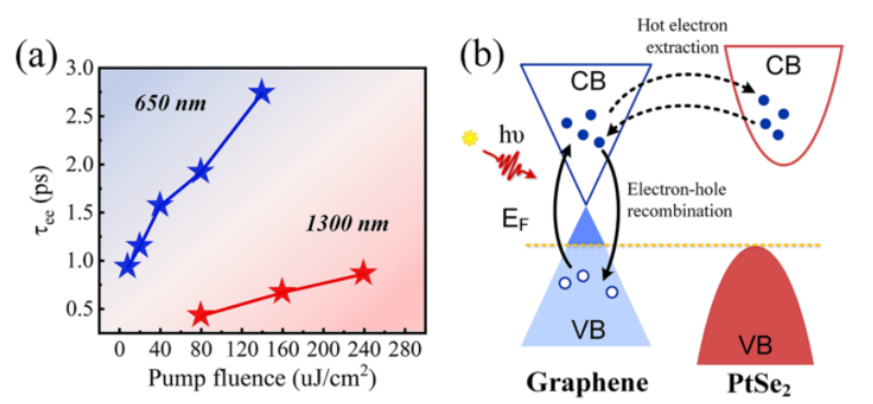 圖3. (a)分別在1300 nm(紅色)和650 nm(藍(lán)色)激發(fā)下石墨烯和P/G異質(zhì)結(jié)構(gòu)的CT進(jìn)程的泵浦流量依賴性。(b)熱電子從石墨烯穿過界面勢壘并注入PtSe