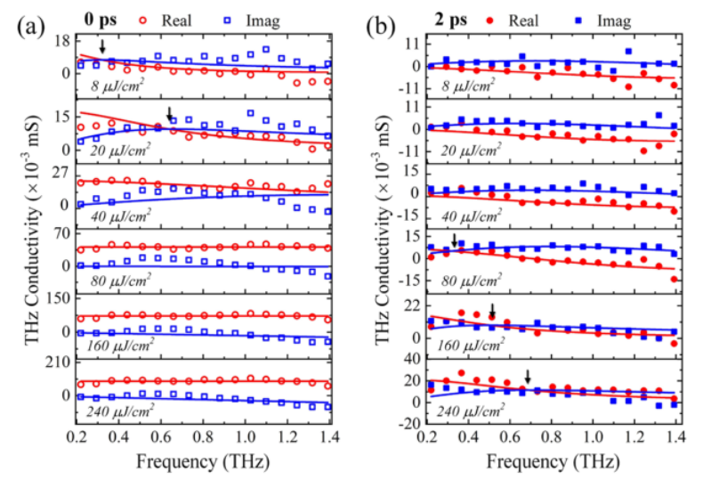 圖4. 分別在(a) 0 ps(空心)和(b) 2 ps(實(shí)心)的延遲時(shí)間下,P/G異質(zhì)結(jié)構(gòu)在1300 nm激發(fā)下的光致電導(dǎo)率的DS模型擬合(圓圈和正方形分別表示THz電導(dǎo)率的實(shí)部和虛部;實(shí)線表示復(fù)電導(dǎo)率的DS模型擬合曲線;箭頭表示散射率γs。