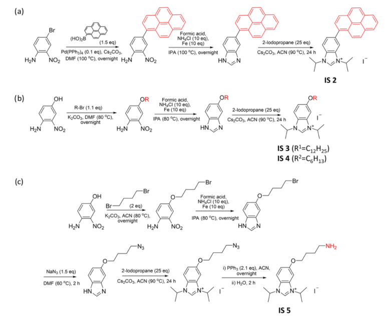 圖5. (a) 1,3-二異丙基-5-(芘基)-1H-苯并[d]咪唑碘化物(2),(b) 1,3-二異丙基-5-(十二烷氧基)-1H-苯并[d]咪唑碘化物(3)/1,3-二異丙基-5-(己氧基)-1H-苯并[d]咪唑碘化物(4),和(c) 1,3-二異丙基-5-(氨基丁氧基)-苯并[d]咪唑碘化物(5)的合成。