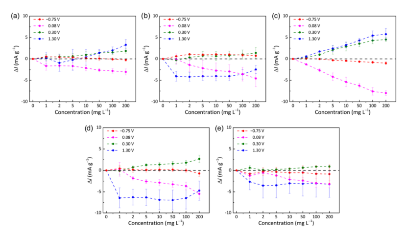 3)下測量的OIT濃度的函數(shù)的電流變化(δI)的代表性曲線圖。(b e)CGNHs響應(yīng)的PCA圖,其中在不同濃度和電位下測量δI值;相同化學(xué)物質(zhì)的得分點由一條線按照濃度順序連接起來(目標(biāo)濃度為1-200mg L