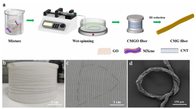 石墨烯基纖維超級電容器(FSSCs)作為最具前景的儲能器件之一,正受到廣泛關(guān)注。然而,純石墨烯纖維的比電容與本征脆性之間的矛盾阻礙了其實際應(yīng)用。在此,我們開發(fā)了一種制備具有高韌性和高電學(xué)和電化學(xué)性能的石墨烯基三元復(fù)合CNT/MXene/石墨烯(CMG)纖維電極的策略。這些性能歸因于石墨烯片內(nèi)的三維交聯(lián)導(dǎo)電網(wǎng)絡(luò),通過酸化碳納米管、石墨烯片和MXene之間的共價鍵和π - π相互作用,這大大提高了CMG纖維的抗拉強度、韌性和電傳輸。優(yōu)化后的CMG纖維具有高韌性(約1.7 MJ m