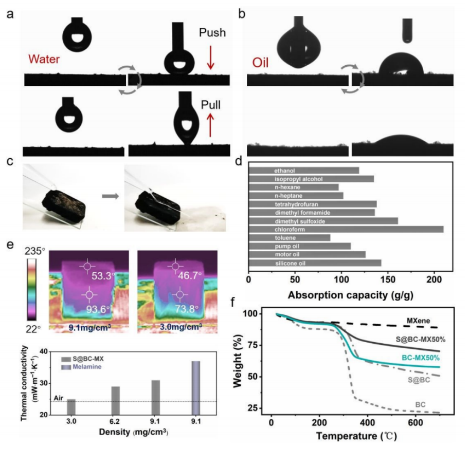 圖4. S@BC-MX50%氣凝膠的表面潤濕性和熱性能。