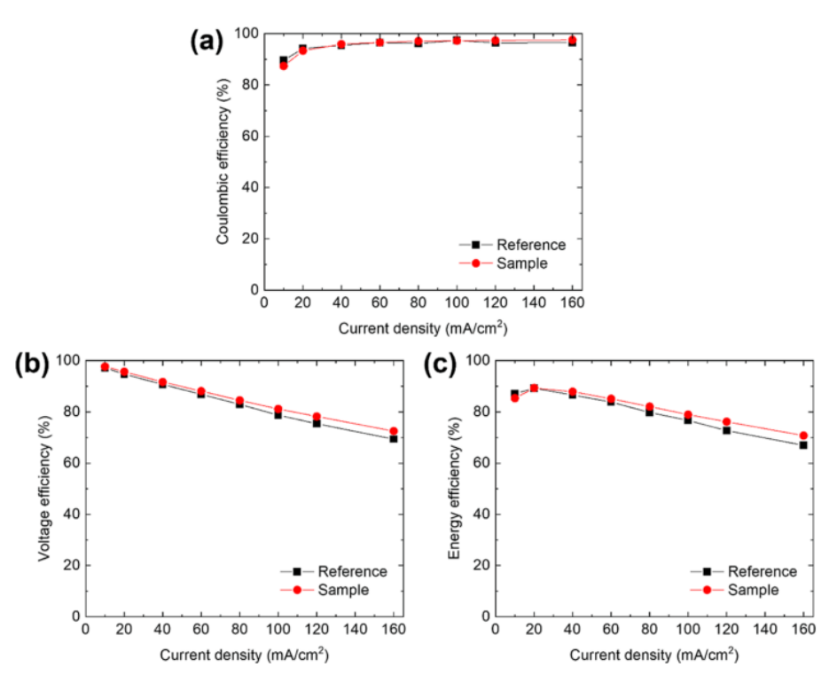 圖 6. 樣品和參比電解質(zhì)在不同電流密度下的 VRFB 電池性能:(a) CE、(b) VE 和 (c) EE。