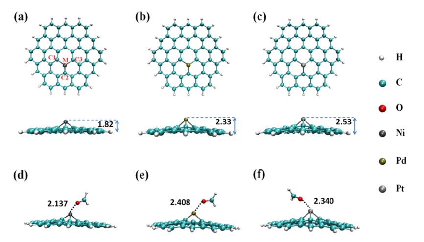 圖1. (a) G(Ni), (b) G(Pd), (c) G(Pt), (d) G(Ni)/HCHO, (e) G(Pd)/HCHO, (f) G(Pt)/HCHO復(fù)合物的優(yōu)化構(gòu)型。