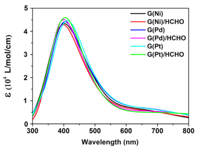 圖6. 摻雜石墨烯及其和HCHO分子復(fù)合物的紫外可見(jiàn)光譜。