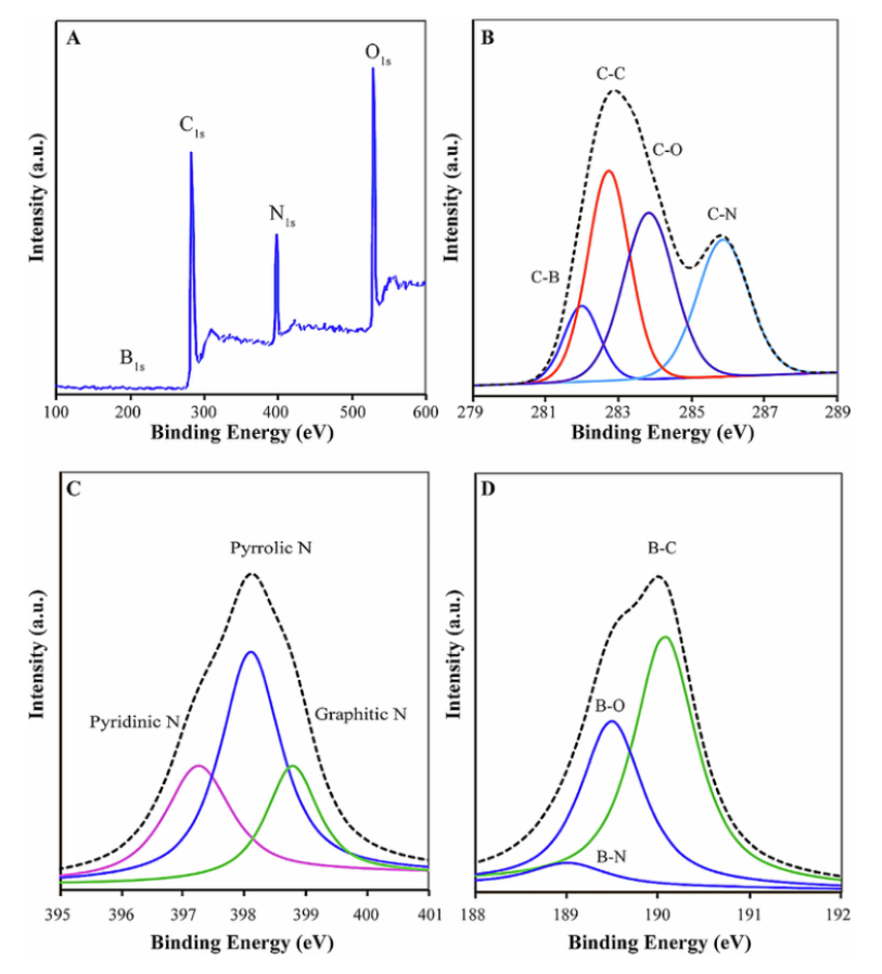石墨烯量子點(diǎn)在生物傳感、熒光成像、生物醫(yī)學(xué)、能量?jī)?chǔ)存與轉(zhuǎn)化、催化等方面得到了廣泛的應(yīng)用,但高發(fā)光效率的多色石墨烯量子點(diǎn)的設(shè)計(jì)與合成仍面臨著巨大的挑戰(zhàn)。該研究報(bào)道了通過一步熱解合成組氨酸、絲氨酸和五乙烯己胺功能化和硼摻雜石墨烯量子點(diǎn)(HSPB-GQD)。HSPB-GQD由2-5納米的石墨烯片組成,含有羧基、羥基、氨基、亞氨基和咪唑。組氨酸、絲氨酸、五乙烯己胺和硼原子的協(xié)同作用改善了發(fā)光行為。這實(shí)現(xiàn)了獨(dú)特的可切換雙色發(fā)光。在370 nm的紫外激發(fā)下,產(chǎn)生一個(gè)強(qiáng)烈的藍(lán)色熒光,最大發(fā)射波長(zhǎng)為455 nm,量子產(chǎn)率為72.34%??梢姽庠?80 nm激發(fā)下產(chǎn)生強(qiáng)烈的黃色熒光,最大發(fā)射波長(zhǎng)為560 nm,量子產(chǎn)率為72.59%。含氮和含氧基團(tuán)構(gòu)成的多重質(zhì)子解離體系使黃色熒光對(duì)環(huán)境pH值敏感。在4.5 ~ 10.0范圍內(nèi),強(qiáng)度隨pH的增加呈線性增加。有機(jī)分子和無(wú)機(jī)離子不干擾pH值檢測(cè)。HSPB-GQD作為一種對(duì)細(xì)胞活力影響不大的熒光探針,成功地應(yīng)用于生物和環(huán)境水樣的pH檢測(cè)和細(xì)胞成像。