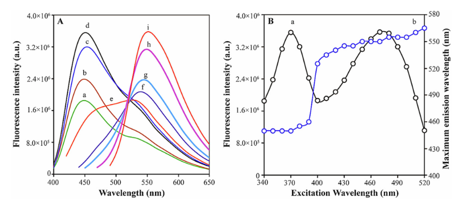 圖4. HSPB-GQD在激發(fā)波長(zhǎng)為340 (a)、350 (b)、360 (c)、370 (d)、400 (e)、420 (f)、430 (g)、450 (h)和480 nm (i)時(shí)的熒光光譜(A)以及峰值熒光強(qiáng)度與激發(fā)波長(zhǎng)(a)和最大發(fā)射波長(zhǎng)與激發(fā)波長(zhǎng)的關(guān)系(b)。