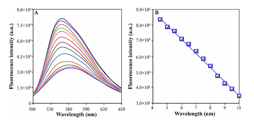 圖7. HSPB-GQD在pH為4.5、5、5.5、6、6.5、7、7.5、8、8.5、9、9.5和10的BR緩沖液中可見光激發(fā)480 nm時(shí)的熒光光譜(A)和560 nm處峰值熒光強(qiáng)度與pH值的關(guān)系曲線(B)。