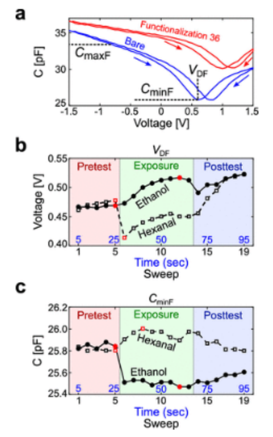 圖2.(a)兩個代表性的C–V曲線,顯示了在預(yù)測試條件下,裸石墨烯器件和功能化器件的測量電容與施加的柵極電壓之間的關(guān)系。用于描述曲線的標量特征標記在藍色曲線上,箭頭指示掃描方向。(b) 在100%濃度己醛和乙醇的測試前、暴露和測試后,裸設(shè)備的VDF和(c)C