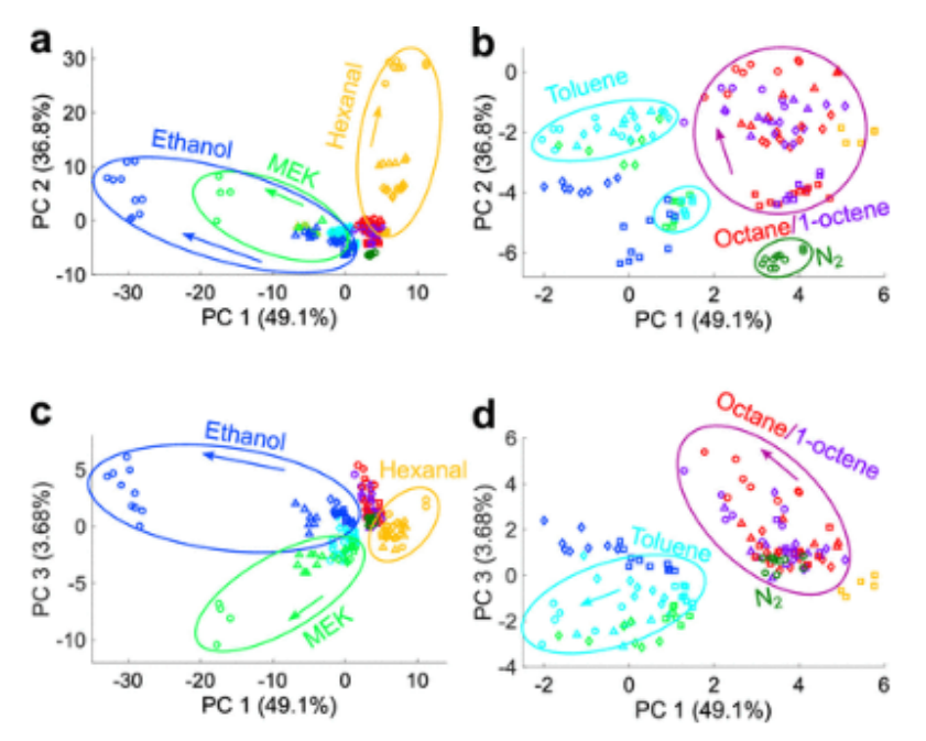 max或TR衍生參數(shù)的PCA評分圖,顯示了測量響應(yīng)對主成分(a,b)1和2以及(c,d)1和3的投影,這些都解釋了數(shù)據(jù)中89.5%的變化。標記符號表示氣體濃度(圓圈:100%;三角形:50%;菱形:10%;正方形:1%飽和蒸汽濃度),顏色表示所標記的氣體種類。箭頭指示氣體種類內(nèi)濃度增加的方向。PC 1和PC 2中的乙醇和MEK基團有些重疊;然而,它們在較弱的PC 3中是不同的。(b)和(d)中的圖分別是(a)和(c)的放大版,以顯示包含辛烷、1-辛烯、甲苯、氮氣的緊密團簇的細節(jié),以及其他三種氣體的低濃度測量。不同濃度的辛烷和1-辛烯形成略微不同的基團;然而,這兩個物種在這些群體中無法區(qū)分。