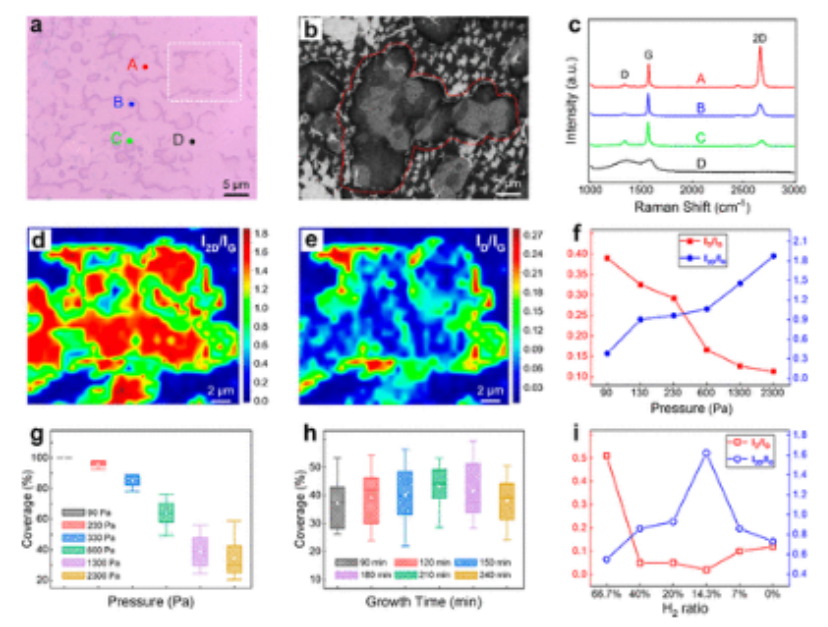 2比率)對石墨烯形態(tài)和質(zhì)量的影響。(a) 在2300 Pa的壓力下在單晶Cu箔上生長的石墨烯的光學(xué)圖像。(b)面板a中白色虛線內(nèi)區(qū)域的SEM圖像。(g,h)石墨烯覆蓋率作為室壓力和生長時間的函數(shù)的統(tǒng)計。(i) I
