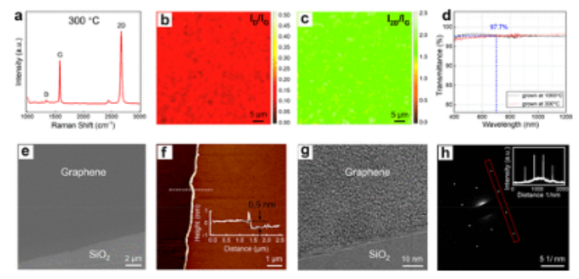 圖3.在300°C下生長的高質(zhì)量石墨烯膜。(a) 300°C下生長的石墨烯的拉曼光譜;其他參數(shù):90Pa,40min,H