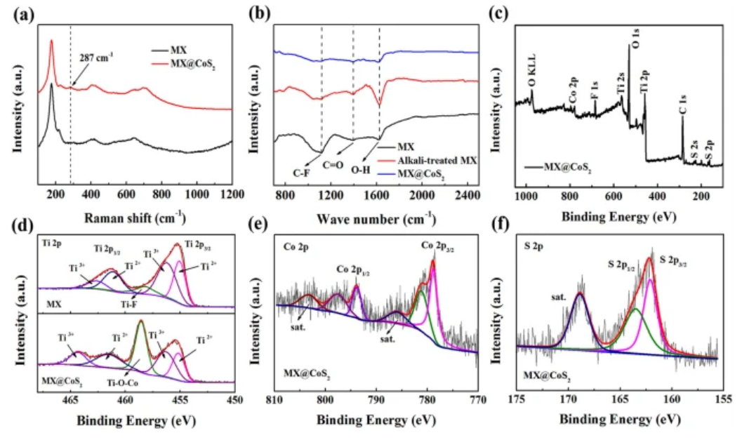 Figure 2. (a-b) MX和MX@CoS?的拉曼光譜和紅外光譜; (c) MX@CoS?的XPS光譜; MX和MX@CoS?的(d) XPS Ti 2p光譜; MX@CoS?的(e) XPS Co 2p和(f) XPS S 2p光譜。