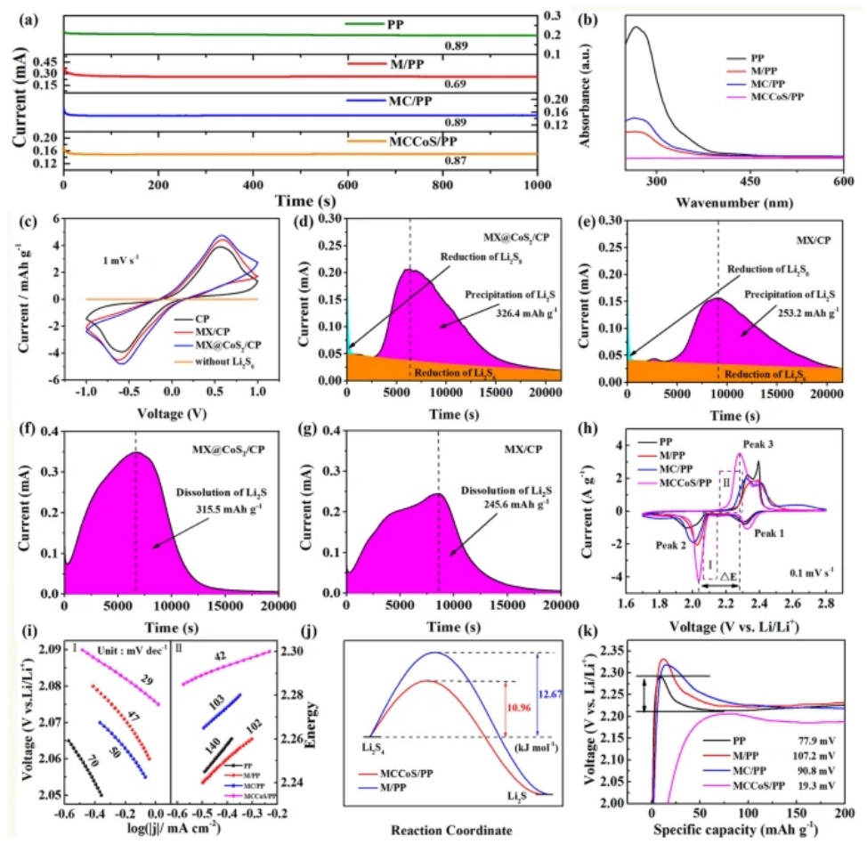 Figure 3. (a) 通過(guò)Li || Li對(duì)稱電池測(cè)試的PP、M/PP、MC/PP和MCCoS/PP隔膜的鋰離子遷移數(shù);(b) 電解槽右側(cè)液體的紫外-可見吸收光譜; (c) 使用CP、MX/CP和MX@CoS?/CP組裝的對(duì)稱電池的CV曲線; (d-e) Li?S的沉積曲線; (f-g) Li?S的溶解曲線; (h) CV曲線; (i)根據(jù)CV曲線的峰值2和峰值3計(jì)算的Tafel圖; (j) Li?S?還原的活化能(Ea); (k)基于不同隔膜的鋰硫電池充電曲線。