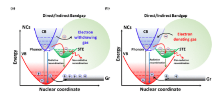 圖6.無鉛鈣鈦礦的擬議傳感機制。帶隙變窄和載流子通過能量景觀的輻射復合。當使用石墨烯上負載的無鉛鈣鈦礦納米晶體時,氧化(a)和還原(b)氣體的綜合檢測機制。STE:自陷激子。Gr:石墨烯。