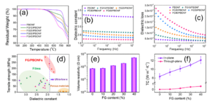圖4.FG/PBONF的多功能特性。(a) 熱重曲線。(b) 在不同頻率下測量的介電常數(shù)和(c) 介電損耗。(d)阿什比圖表明,在這項工作中開發(fā)的FG/PBONFs達到了新的機械強度和介電性能水平,超過了所有其他報告的低κ材料。(e) 體積電阻率隨FG含量的變化。(f) 面內(nèi)和通面TC對FG含量的依賴性。