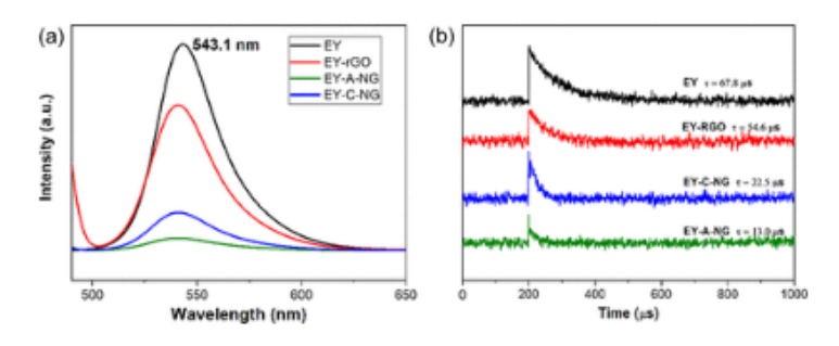 圖5.(a)熒光光譜和(b)在添加rGO、C-NG或a-NG復(fù)合物前后,在532nm的脈沖照射下,3EY*在580nm處的瞬態(tài)吸收衰減。條件:25.0μg mL