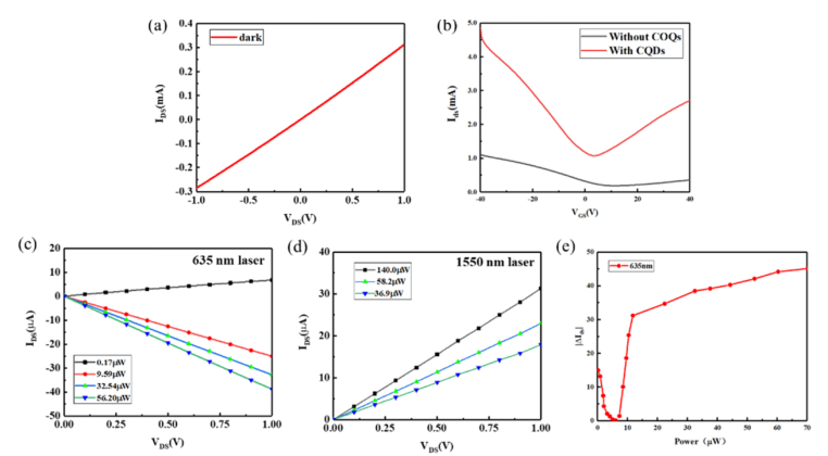 圖2. PbS -石墨烯器件的電氣和光學(xué)測試。(a) I-V特性(b) PbS量子點薄膜組裝前后的傳輸曲線。(c) (d) 635 nm和1550 nm激光在不同功率密度下光電流隨偏置的變化。(e)光電流對激光功率照射的依賴性。