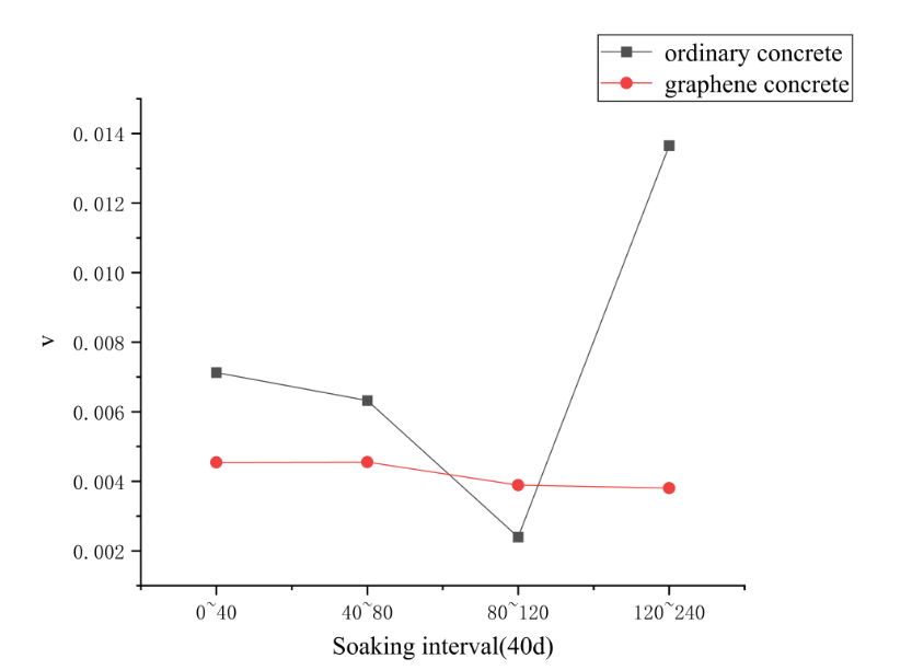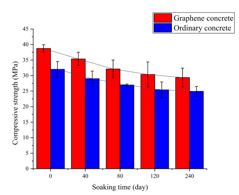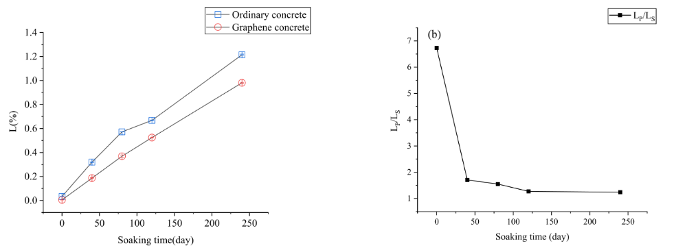 在海洋環(huán)境中,氯化物侵蝕對混凝土耐久性的影響最為顯著。論文研究了石墨烯對氯離子長期腐蝕混凝土微觀結構和抗壓性能的影響。結果表明,在氯化鈉溶液中浸泡0、40、80、120和240天后,添加0.05 wt%的石墨烯納米片(GNPs),其抗壓強度較普通混凝土分別提高了20.92%、21.97%、19.13%、19.43%和17.81%。隨著氯離子腐蝕時間的增加,石墨烯混凝土的動態(tài)彈性模量逐漸增大。兩種混凝土的SEM、XRD、抗壓性能和氯離子含量測試結果表明,石墨烯混凝土抗氯離子性能比普通混凝土更好、更穩(wěn)定。