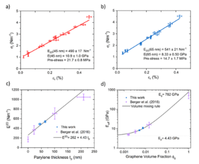 2D與聚對(duì)二甲苯厚度,。對(duì)于本工作中的數(shù)據(jù),y誤差條來(lái)自(a,b)的線性回歸中的不確定性。x誤差條是七個(gè)厚度測(cè)量值的標(biāo)準(zhǔn)偏差。(d)GPH膜的有效體積模量是石墨烯體積分?jǐn)?shù)的函數(shù),符合體積混合規(guī)則。兩條水平虛線表示提取的石墨烯和聚對(duì)二甲苯的體積模量。通過(guò)組合(a,b)的線性回歸中的誤差和膜厚度的不確定度來(lái)量化誤差條。Berger等人(2016)的數(shù)據(jù)誤差條通過(guò)結(jié)合所述E2D和膜厚度不確定度中的所述不確定度進(jìn)行量化。