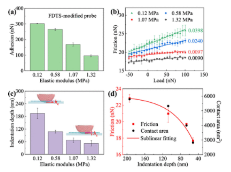 圖3:(a)附著力,(b)摩擦力與載荷的關(guān)系,以及(c)使用FDTS修飾的SiO2探針在不同彈性模量的PDMS基底上的石墨烯壓痕深度。(c)的插圖顯示了FDTS修飾的探針和石墨烯之間的界面示意圖,其彈性模量相對(duì)較低和較高。(d) 摩擦力和接觸面積是壓痕深度的函數(shù)。用于附著力測(cè)量的法向載荷為10 nN。石墨烯的厚度是1.3納米。