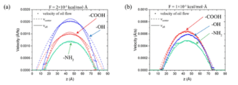 –2 kcal/mol•Å。通過中心速度和所有速度擬合,可以觀察到中心粘度和表觀粘度之間的明顯差異。此外,在大的驅(qū)動(dòng)力下,-OH官能化通道顯示出優(yōu)異的油傳輸性能,而在相對(duì)較低的驅(qū)動(dòng)力之下,油傳輸速度仍然與通道壁的親水性一致。