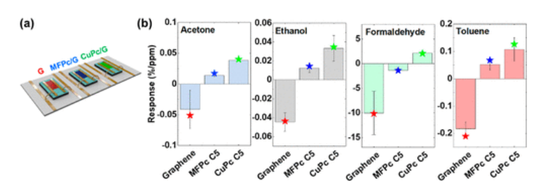 圖4.(a) 包含石墨烯傳感器、MFPc_C5傳感器和CuPc_C5傳感器的傳感器陣列的示意圖,以及(b)當(dāng)暴露于丙酮、乙醇、甲醛和甲苯時(shí)陣列的傳感響應(yīng)。星形表示如(a)所示的傳感器陣列的響應(yīng),而條形表示如圖3所示獲得的石墨烯、MFPc C5和CuPc C5的響應(yīng)。