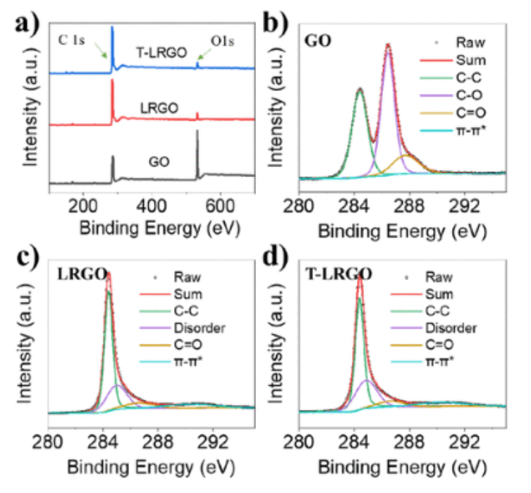 圖3.(a)XPS測量和高分辨率C1s光譜的(b)GO、(C)LRGO和(d)T-LRGO。測量光譜顯示激光輻射后O含量顯著降低;GO的C1s光譜顯示了大量氧化碳C–O(286.4eV)和C═O(287.7eV);C–C(284.4eV)鍵的優(yōu)勢以及LRGO和T-LRGO中π–π*(291.2eV)的存在證明了激光已經(jīng)降低了GO。