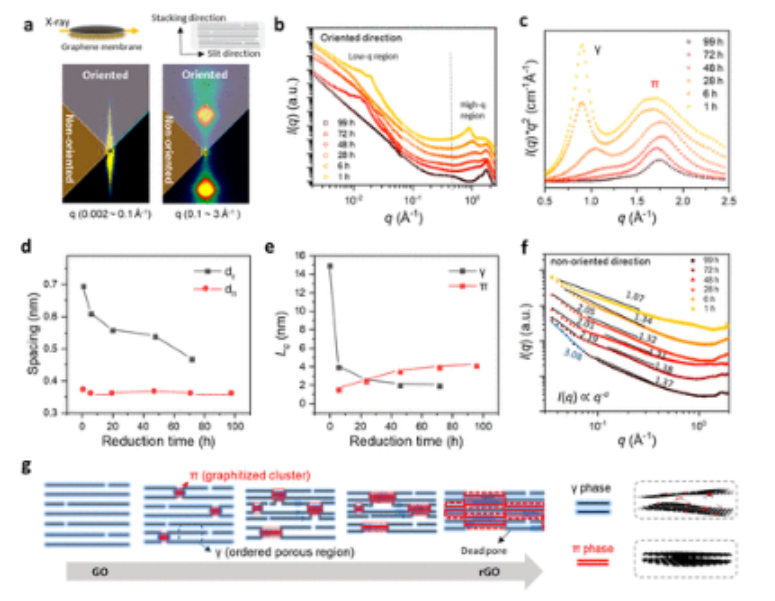 2 vs q)。(d) Kratky圖中確定的兩個相關(guān)距離的圖。(e) 兩個結(jié)構(gòu)單元的堆積高度(Lc)的比較:γ相和π相。(f) 來自二維SAXS圖案的一維散射曲線,通過區(qū)域掩膜在非定向方向上的平均化(用橙色突出)。(g) GO膜還原過程中的結(jié)構(gòu)轉(zhuǎn)變示意圖。