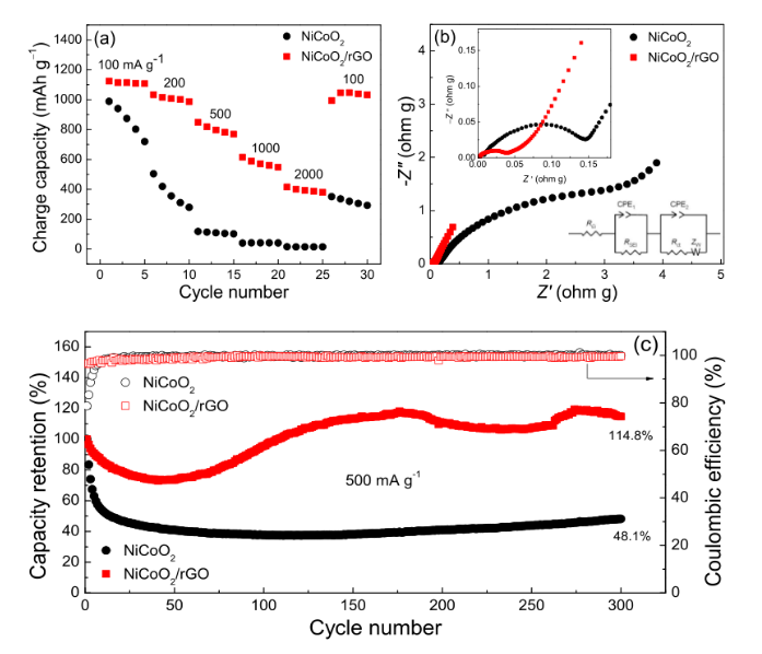 2/rGO電極的(a)倍率性能,(b) Nyquist圖(插圖為高頻范圍內(nèi)Nyquist圖的特寫視圖和相應(yīng)的等效電路模型)和(c)循環(huán)性能(500 mA g