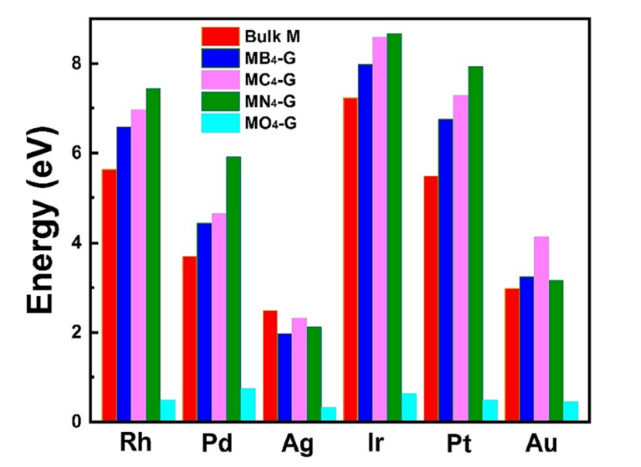 4-G)的貴金屬單原子(M = Rh, Pd, Ag, Ir, Pt, Au)的幾何、電子和磁性能。結(jié)果表明,Rh、Pd、Ir、Pt和Au原子不能與O