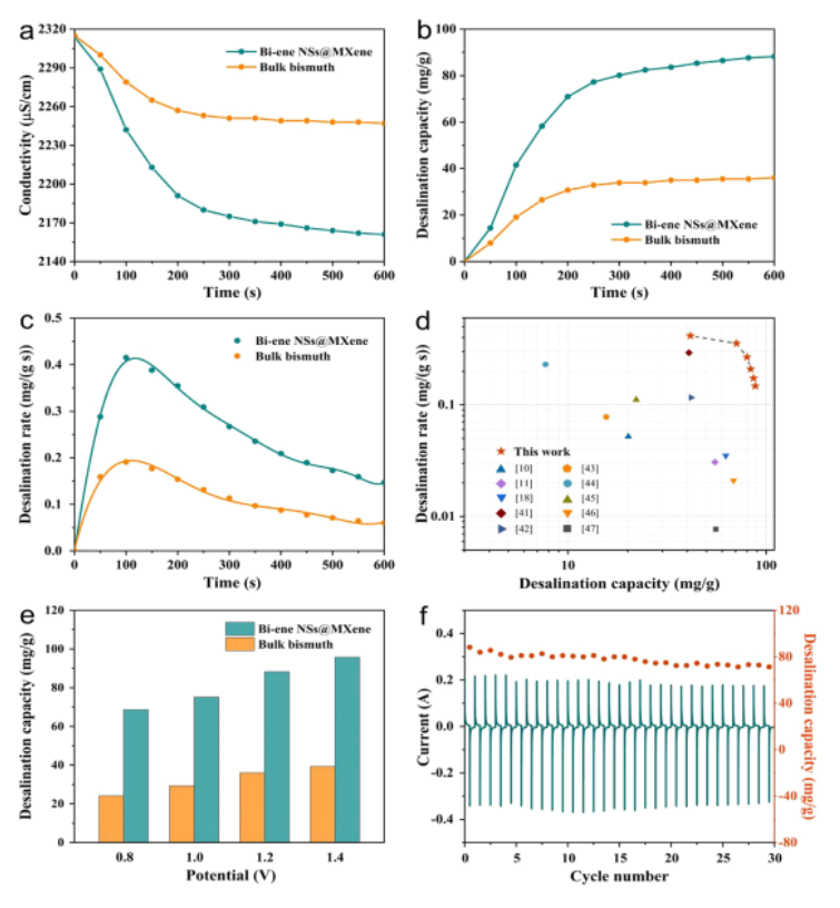 圖5 (a)電導(dǎo)率瞬變,(b)相應(yīng)的海水淡化能力瞬變,(c) 1.2 v時Bi-ene NSs@MXene異質(zhì)結(jié)構(gòu)和體積鉍的海水淡化速率瞬變。(d) Bi-ene NSs@MXene異質(zhì)結(jié)構(gòu)和其他HCDI系統(tǒng)的Kim−Yoon−Ragone圖。(e)在各種恒定電位下,雙烯NSs@MXene異質(zhì)結(jié)構(gòu)和散裝鉍的淡化能力。(f)雙烯NSs@MXene異質(zhì)結(jié)構(gòu)在1.2 V下的循環(huán)穩(wěn)定性測試。