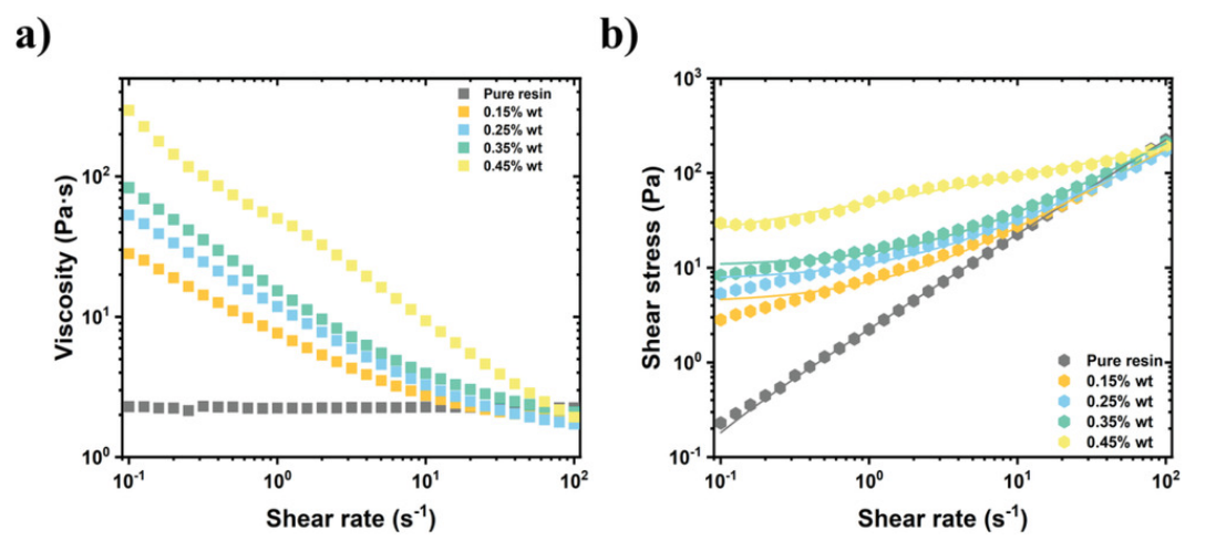 Fig 4. a) 粘度和 b) 剪切應(yīng)力作為包含不同重量分?jǐn)?shù)的 GO 的丙烯酸酯樹脂的剪切速率的函數(shù)。
