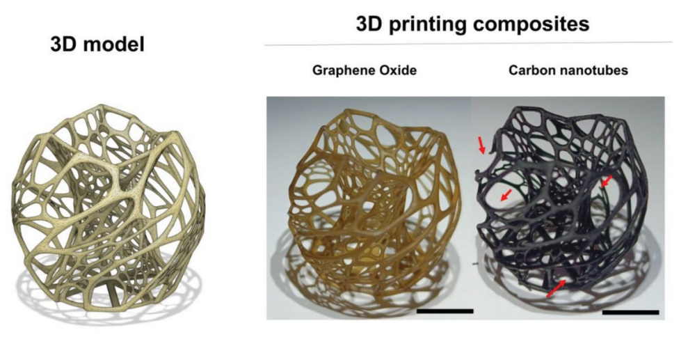 Fig 6. 復(fù)雜結(jié)構(gòu)的數(shù)字模型和 0.15 wt.% GO 復(fù)合材料和 0.15 wt.% MWCNTs 復(fù)合材料的 3D 打印照片。紅色箭頭顯示 3D 打印過(guò)程中的故障。比例尺:1 厘米。