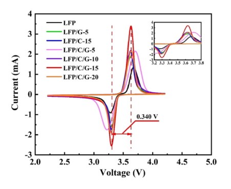 圖4. 不同石墨烯含量的LFP、LFP/G-5、LFP/C-15和LFP/C/G復(fù)合材料的CV曲線。