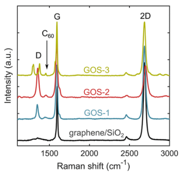 圖3. 原始GOS(黑色)、GOS-1(藍色)、GOS-2(紅色)和GOS-3(綠色)在532nm激光激發(fā)波長下的拉曼光譜。