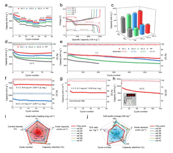 -2 的 Li-S 電池的循環(huán)性能。 (h) 插入 VC-1/PP 的 Li-S 軟包電池在 0.2 C 下的循環(huán)性能,插圖顯示了由串聯(lián)軟包電池點(diǎn)亮的 LED 器件。 (i–j) 雷達(dá)圖顯示了這項(xiàng)工作與其他報(bào)告之間的鋰硫電池性能比較。