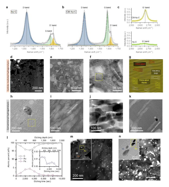 Fig 2. 催化氫解后碳的結(jié)構(gòu)分析和缺陷誘導(dǎo)電偶置換后的表征。 (a 和 b) hy-C (a) 和 CM-hy-C (b) 的拉曼散射光譜。 (c) CM-hy-C(頂部)和 hy-C(底部)中二維峰的拉曼光譜。 (d) CM-hy-C 表面的橫截面 TEM 圖像。 (e-g) 高分辨率 HAADF STEM 圖像(e 和 f)和放大的 FFT 反相圖像(g),用于研究 CM-hy-C 上石墨烯殼的缺陷。 (h-j) hy-C 表面 (h) 的橫截面 TEM 圖像和 hy-C 中納米通道的放大 TEM 圖像(i 和 j)。 (k) hy-C 中納米通道的 HAADF STEM 圖像。(l) 使用 XPS 深度剖析對(duì) GR|CM-hy-C 進(jìn)行元素定量分析。插圖:Au 元素的放大圖。 (m 和 n) GR|CM–hy–C (m) 和 GR|hy–C (n) 背散射電子模式的 SEM 分析。插圖:GR|CM–hy–C (m) 的 HAADF STEM 圖像和 GR|hy–C (n) 的 TEM 圖像。