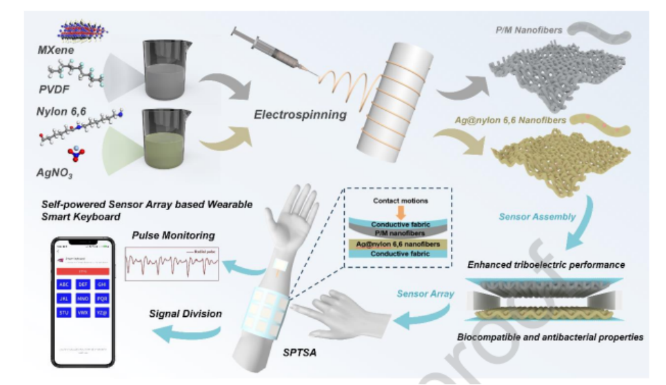 隨著前沿技術(shù)的快速發(fā)展,自供電的透氣可穿戴電子紡織品因其便攜、方便的電源而備受關(guān)注。在這項工作中,我們設(shè)計了一種用于自供電觸覺傳感的生物相容性和抗菌的全紡織結(jié)構(gòu)摩擦電納米發(fā)電機,由摻雜MXene的PVDF (P/M)納米纖維和抗菌的Ag納米顆粒修飾的尼龍6,6 (Ag@nylon 6/6)納米纖維分別作為摩擦電負材料和正材料構(gòu)建。通過實驗和理論研究,全面評估了MXenes在PVDF納米纖維中的相互作用、表面電位、透氣性、拉伸強度、生物相容性和摩擦電性能的影響。將所研制的P/M納米纖維膜與具有摩擦學(xué)正性的Ag@nylon 6/6納米纖維配對制備出TENG,其輸出電壓為362 V,輸出電流為38.5 μA。通過電容充電和低功率器件(如時鐘,95個商用led)的運行,進一步證明了摩擦電收集特性。此外,基于Ag@nylon 6,6和P/M纖維膜的自供電觸覺傳感器實現(xiàn)了來自不同動脈的超靈敏運動和脈搏檢測,制作的觸覺傳感器陣列在智能可穿戴鍵盤的應(yīng)用以及高分辨率觸覺映射方面顯示出巨大的潛力。