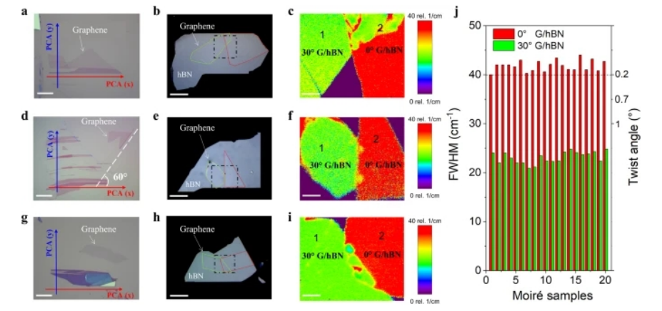 Fig 2. 使用相鄰的石墨邊緣將頂部六方氮化硼和石墨烯完美對齊。 a 單層石墨烯與相鄰石墨邊緣連接的光學(xué)圖像。 b 使用 (a) 的石墨邊緣對準(zhǔn)后的 G/hBN 堆疊。紅線描繪了0°G/hBN 的輪廓,綠線描繪了30°G/hBN 的輪廓。 c (b)中黑色虛線區(qū)域拉曼二維波段半高寬的空間圖。 d 單層石墨烯的一個邊緣(白色虛線)與相鄰的石墨邊緣成 60°。 e 使用 (d) 的石墨邊緣對準(zhǔn)后的 G/hBN 堆疊。 f (e) 中黑色虛線區(qū)域拉曼 2D 波段 FWHM 的空間圖。 g 單層石墨烯與相鄰石墨邊緣沒有任何連接。h 使用 (g) 的石墨邊緣對準(zhǔn)后的 G/hBN 堆疊。 i (h) 中黑色虛線區(qū)域的拉曼 2D 波段 FWHM 空間圖。比例尺,20 µm(a、d、g); 5 µm(b、e、h); 2 µm(c、f、i)。 j 20 個莫爾條紋樣本的拉曼 2D 波段和扭轉(zhuǎn)角的 FWHM 直方圖。~20 cm