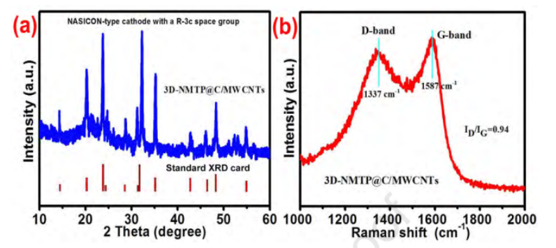 圖1. (a) 3D-NMTP@C/MWCNTs的XRD譜圖和(b)拉曼光譜。