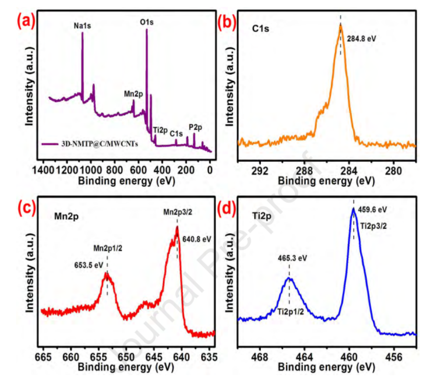 圖2. (a-d)所設(shè)計(jì)的3D-NMTP@C/MWCNTs復(fù)合材料的XPS光譜。