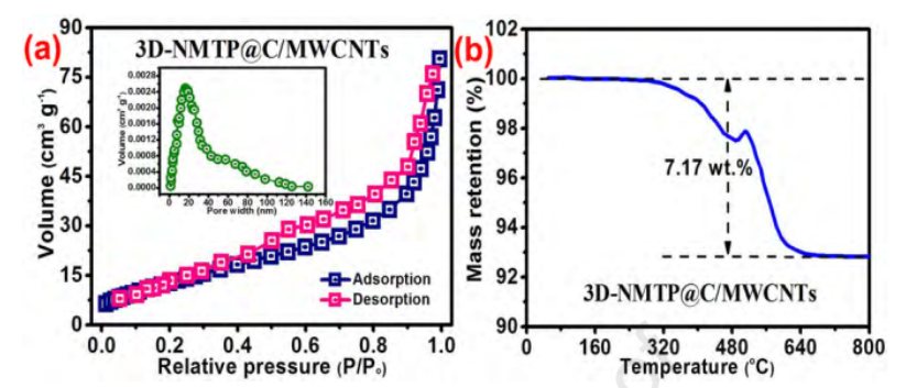 2吸附/解吸曲線;圖3a中的插圖是孔徑分布剖面;(b) 3D-NMTP@C/MWCNTs樣品在空氣氣氛下的TGA曲線。