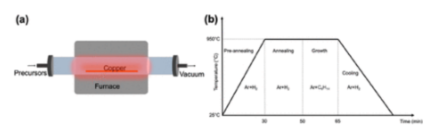 圖1.(a) LPT-CVD的示意圖和(b)石墨烯合成的溫度分布。