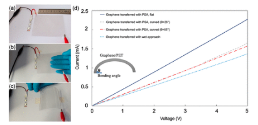圖7.(a–c)轉(zhuǎn)移石墨烯的PET基板的照片。(d)PET上石墨烯在平坦和彎曲條件下的I–V特性。